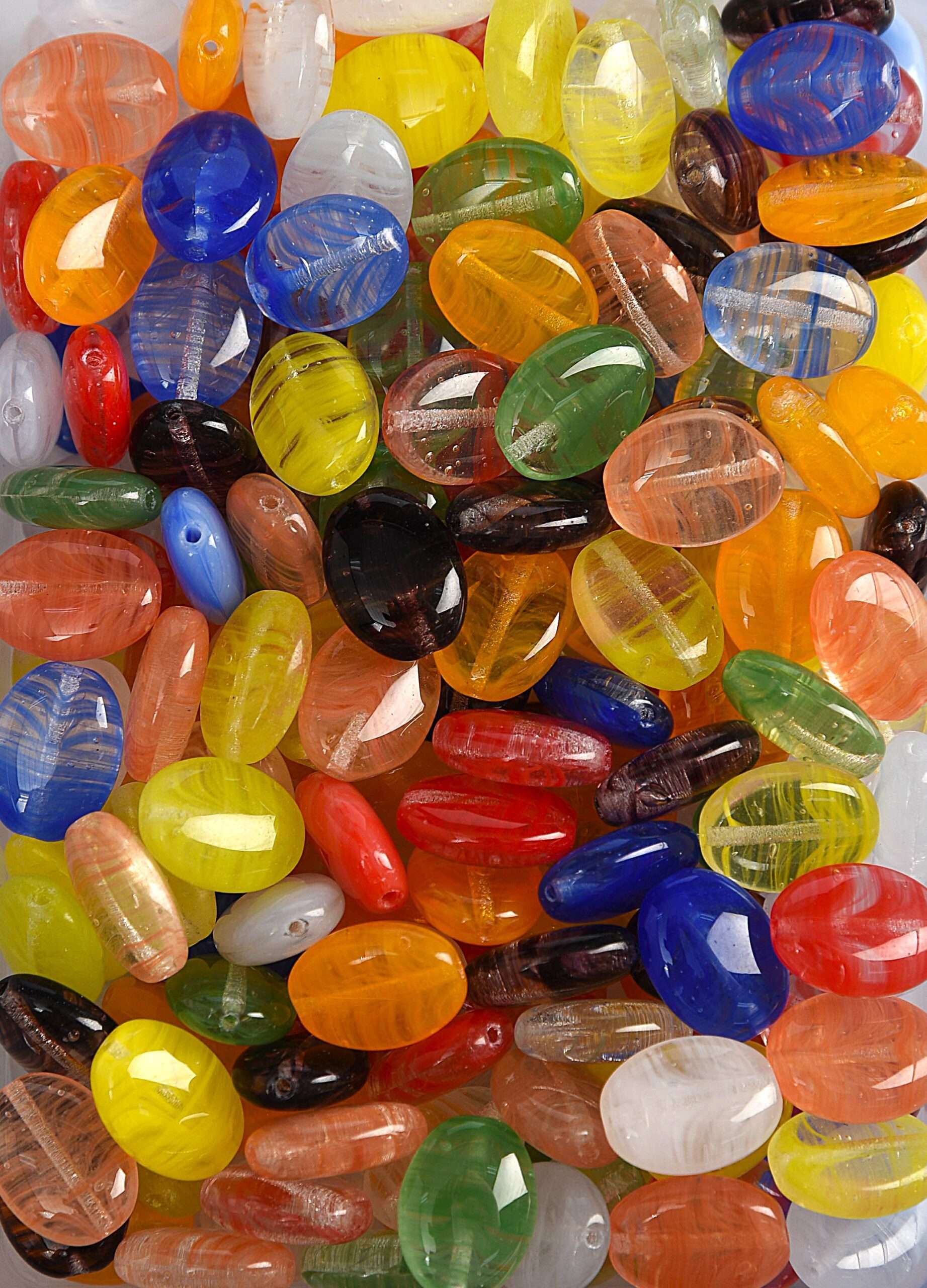 Mix of different sized and colored flat oval shaped Czech glass beads.