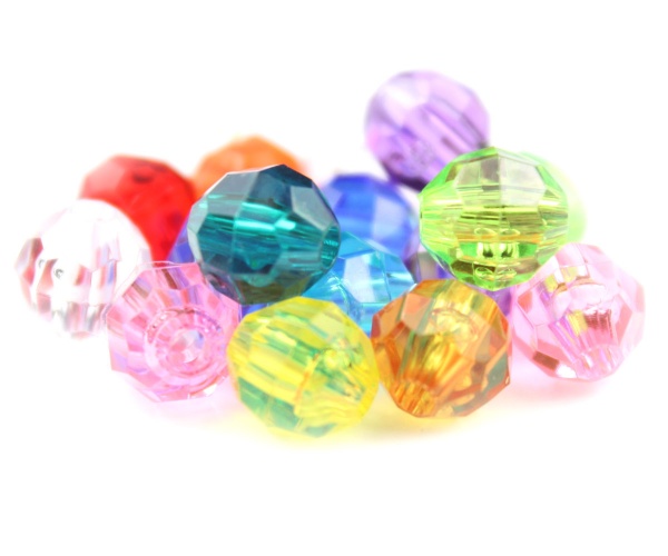 Lajitelma erivärisiä särmikkäitä, fasettipyöreitä akryylihelmiä. Useita eri sävyjä, halkaisija 8mm.